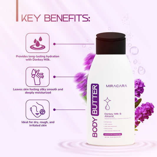 Deep nourishment / instant hydration/ soft and supple skinWrap your skin in luxurious moisture with Miracara Body Butter – a rich, creamy blend specially formulated to deeply nourish and soften dry, rough skin. Enriched with natural butters and oils, it melts effortlessly into your skin, leaving it velvety smooth, hydrated, and delicately scented all day long.